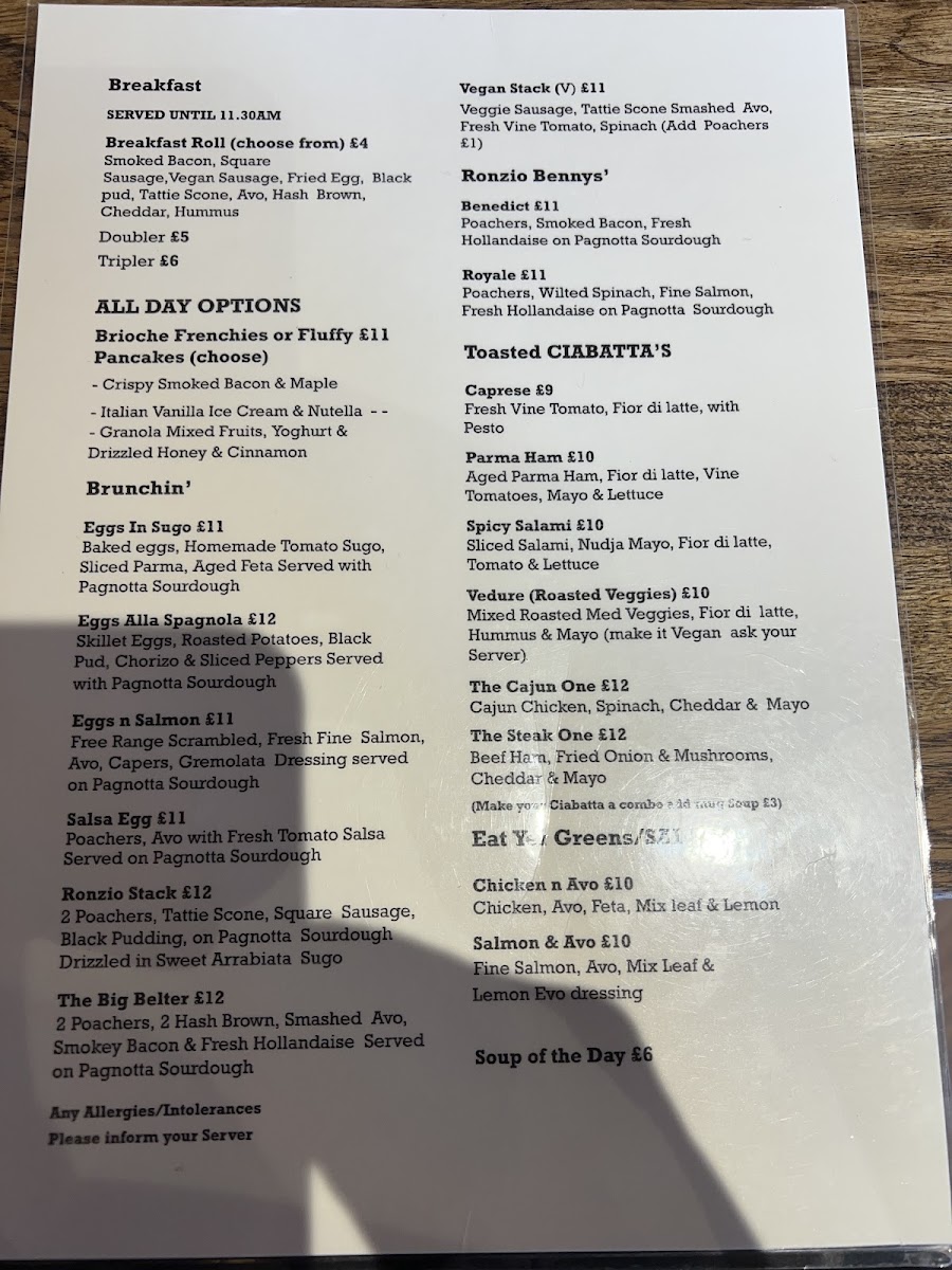 One visit to Ronzio Coffeehouse and you'll quickly understand why it's a beloved favorite among locals. The menu boasts an array of tempting options from the brunch section, including the comforting Eggs In Sugo and the zesty Eggs Alla Spagnola, both priced at just £12.00. Seafood lovers can indulge in the Eggs N Salmon for £11.00, while those searching for a satisfying stack can opt for the Ronzio Stack. Toasted ciabattas add further variety, featuring flavors like Caprese and Parma Ham, all for £10.00 to £12.00.